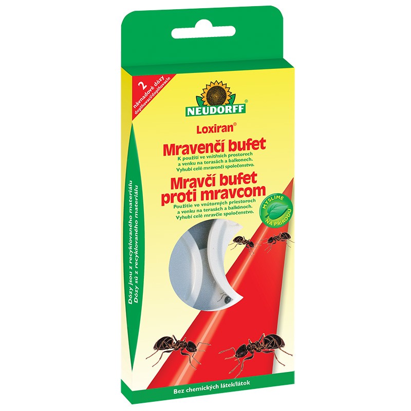 NEUDORFF Loxiran Mravenčí bufet - doplňovací návnadová dóza s účinnou látkou spinosad je určena k účinné likvidaci mravenců ve vnitřních prostorech a venku na terasách a balkónech. Dózy je třeba umístit do blízkosti mravenišť nebo na mravenčí stezky. Nedávejte dózu na přímé slunce. Po požití návnady dělnicemi, larvami a královnou dojde k postupnému vyhubení celého mravenčího společenství.
