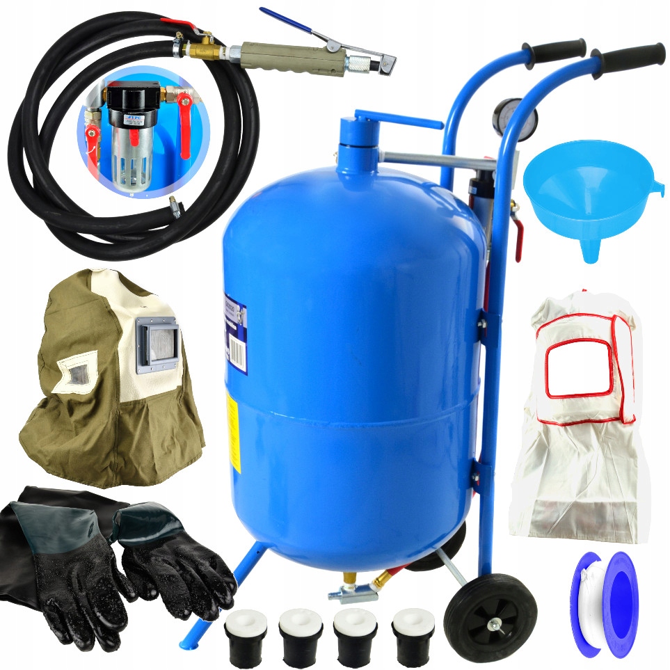 Mobilní tryskací jednotka G02020 o objemu 76 litrů, známá též jako pískovačka, je zařízení používané pro čištění, odstraňování nátěrů a povrchovou úpravu různých materiálů pomocí tlakového proudu abrazivních materiálů, jako je písek nebo jiné tvrdé částice. Pískovačka je perfektní pro čištění hliníkových ráfků, dílů karoserie, odstraňování rzi, koroze, zbytků různých typů barev a laků. Dehydrátor použitý v pískovačce redukuje množství vody ve vzduchu na takové množství, aby nedocházelo k ucpání odpaliště, kde se mísí písek se vzduchem. Bez dehydrátoru se sypač písku často ucpe a zablokuje, což je z dlouhodobého hlediska unavující. Bezpečný provoz zajišťuje pojistný ventil.