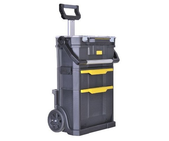 Stanley STST1-79231 pojízdný box Rolling Workshop rozkládací Rozkládací pojízdný box, samostatně přenositelný box i zásuvky. horní 19" box s odnímatelným organizérem je uzamykatelný spodní díl se skládá z hluboké zásuvky a úložného prostoru pro nářadí odolná hliníková teleskopická rukojeť umožňuje nastavení do několika výšek u zásuvek jsou použity kuličková ložiska velmi odolná 7" kolečka usnadňují průchod terénem rozměry: 56 x 76 x 38 cm